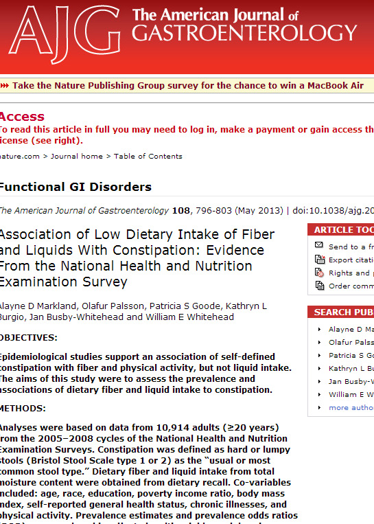 A este respecto aportamos un comentario sobre una encuesta National Health and Nutrition Examination Survey que intenta demostrar la relación entre la ingesta de fibra en la dieta y de los líquidos con la constipación intestinal.