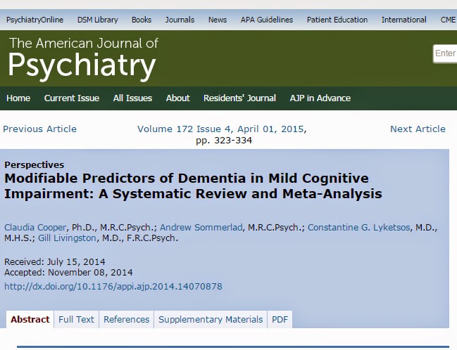 Cooper C1, Sommerlad A, Lyketsos CG, Livingston G. Modifiable predictors of dementia in mild cognitive impairment: a systematic review and meta-analysis. Am J Psychiatry. 2015 Apr 1;172(4):323-34. doi: 10.1176/appi.ajp.2014.14070878. Epub 2015 Feb 20.